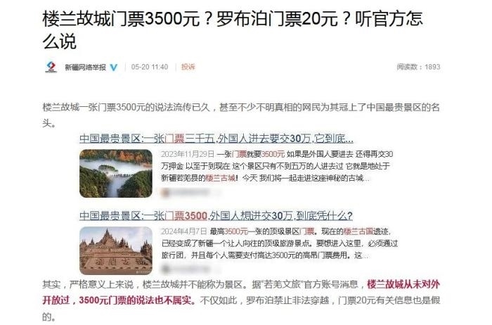 文章稱, ?樓蘭故城一張門票3500元的說法流傳已久,甚至不少不明真相的網(wǎng)民為其冠上了中國(guó)最貴景區(qū)的名頭。其實(shí),嚴(yán)格意義上來說,樓蘭故城并不能稱為景區(qū)。據(jù)“若羌文旅”官方賬號(hào)消息,樓蘭故城從未對(duì)外開放過,3500元門票的說法也不屬實(shí)。不僅如此,羅布泊禁止非法穿越,門票20元有關(guān)信息也是假的。