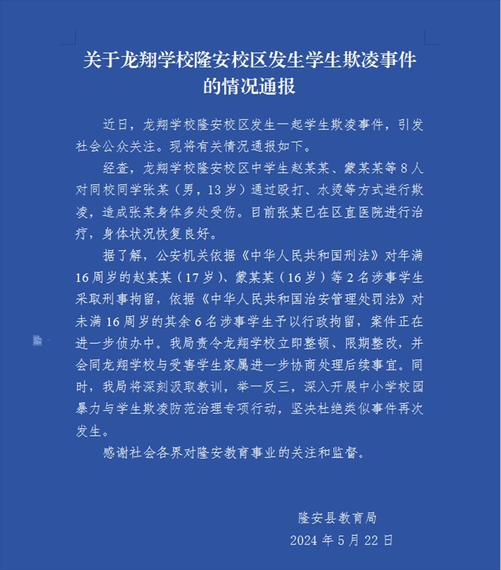 ·廣西隆安通報學(xué)生遭毆打水燙欺凌:2學(xué)生刑拘、6學(xué)生行政拘留。