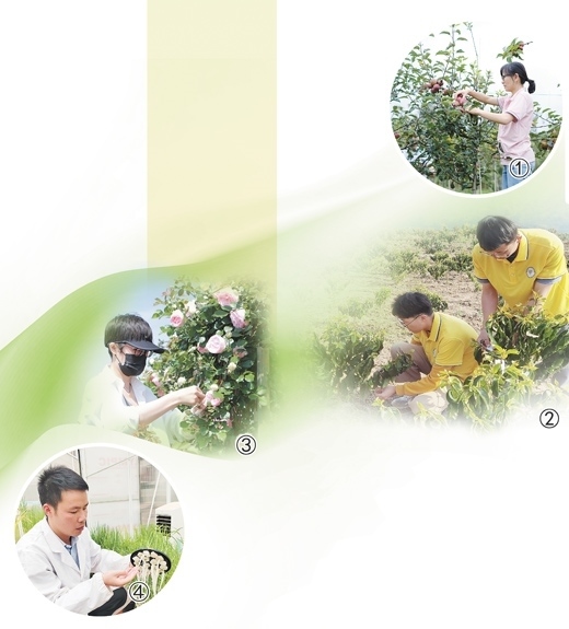 圖①:劉丹丹在調(diào)查蘋果病害情況。 圖②:咖啡團(tuán)隊(duì)的學(xué)生們?cè)诳Х忍锏乩镞M(jìn)行花芽分化調(diào)查。 圖③:周寧寧在進(jìn)行月季雜交授粉。 圖④:雷貴杰在觀察水稻根系的生長(zhǎng)狀況。以上圖片均為受訪者提供
