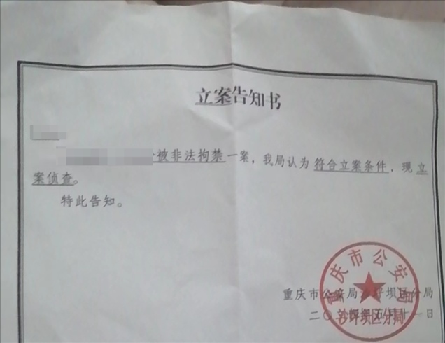 事發(fā)后,家屬向當(dāng)?shù)嘏沙鏊鶊?bào)案。王先生出示的立案告知書(shū)顯示,5月11日,重慶市公安局沙坪壩區(qū)分局對(duì)前文中的夫妻倆被非法拘禁一案立案?jìng)刹椤?/p>