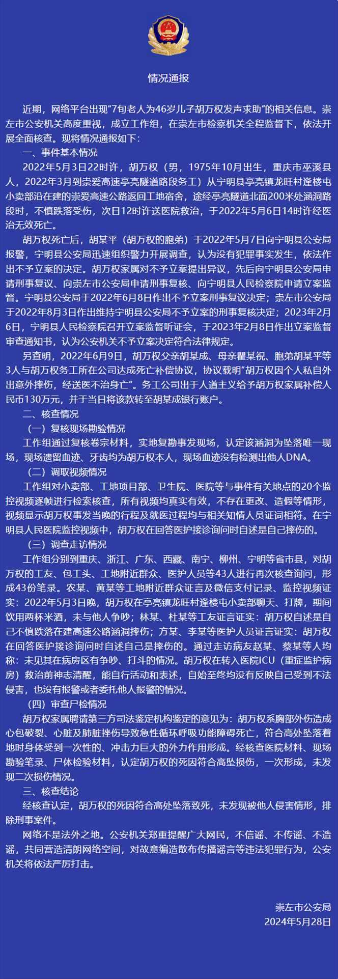 央視網(wǎng)消息:據(jù)“崇左警方”微信公眾號消息,廣西崇左市公安局5月28日通報,近期,網(wǎng)絡平臺出現(xiàn)“7旬老人為46歲兒子胡萬權發(fā)聲求助”的相關信息。崇左市公安機關高度重視,成立工作組,在崇左市檢察機關全程監(jiān)督下,依法開展全面核查?,F(xiàn)將情況通報如下: