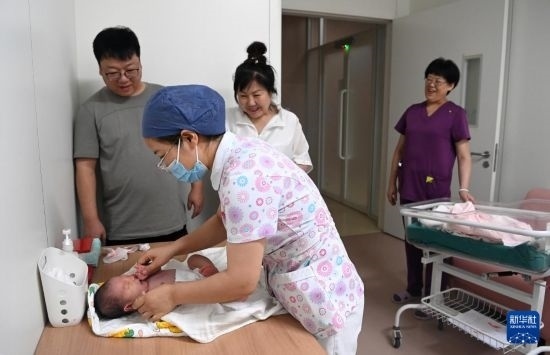 6月1日,在西安國際醫(yī)學中心醫(yī)院新生兒科病房,護士幫助新生兒翻身。