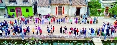 在青田,藝術讓這個村落慢慢蘇醒,也讓青田人對家鄉(xiāng)充滿驕傲與自豪。除了青田水鄉(xiāng)藝術季、“上善若水——藝術龍舟行動”等活動,一場“走田”主題時裝秀,更是點燃了村民的熱情。穿著設計師以鄉(xiāng)村生產(chǎn)生活為靈感設計的服裝,佩戴著自己親手制作的香云紗配飾,道具是平日田間勞作的老物什,村民“模特”們雖面露羞澀,但走在自己最熟悉的鄉(xiāng)野,走出的是自信、堅定的步伐,仿佛在告訴每一個人,這就是我們的生活,我們的時尚。