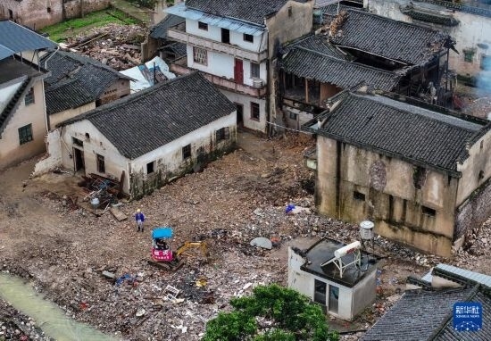 6月28日,工作人員在黃山市歙縣溪頭鎮(zhèn)進行災(zāi)后清理工作(無人機照片)。