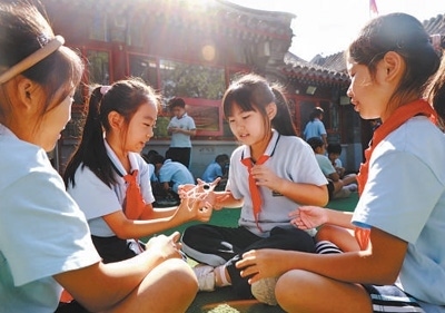 北京市東城區(qū)黑芝麻胡同小學(xué)“課間一刻鐘”,學(xué)生們在做游戲。黃 超 郭 謙攝影報(bào)道
