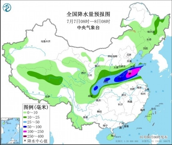 7月7日08時至8日08時,陜西中南部、黃淮大部等地部分地區(qū)有大到暴雨,其中,山東中東部和南部等地部分地區(qū)有大暴雨,山東南部等地局地特大暴雨(250~280毫米)。內(nèi)蒙古中部部分地區(qū)有4~5級風。
