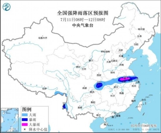 中央氣象臺(tái)7月11日06時(shí)繼續(xù)發(fā)布暴雨黃色預(yù)警:預(yù)計(jì),7月11日08時(shí)至12日08時(shí),四川東北部、重慶中北部、湖北西部和北部、河南東南部、安徽中部、江蘇南部、上海以及西藏東南部、云南西部等地部分地區(qū)有大到暴雨,其中,安徽中部、江蘇西南部、重慶北部等地部分地區(qū)有大暴雨(100~170毫米)。上述部分地區(qū)伴有短時(shí)強(qiáng)降水(最大小時(shí)降雨量20~50毫米,局地可超過60毫米),局地有雷暴大風(fēng)等強(qiáng)對流天氣。