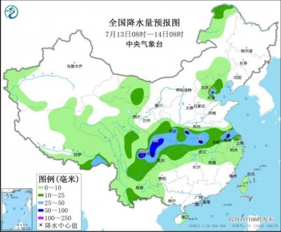 全國降水量預(yù)報(bào)圖(7月13日08時(shí)-14日08時(shí))