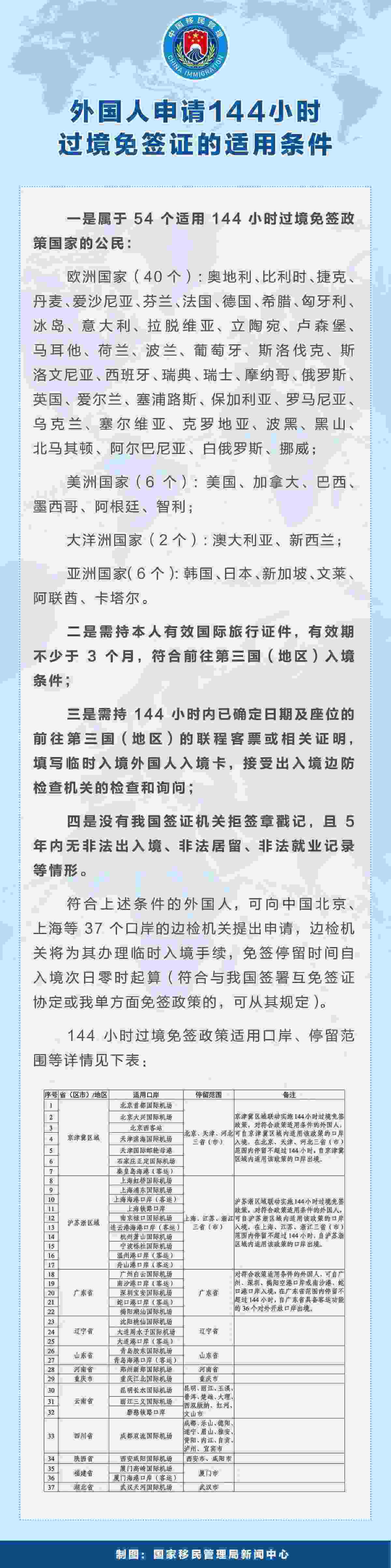 據(jù)了解,截至目前,國家移民管理局已在北京,天津,河北石家莊、秦皇島,遼寧沈陽、大連,上海,江蘇南京、連云港,浙江杭州、寧波、溫州、舟山,河南鄭州,廣東廣州、深圳、揭陽,山東青島,重慶,四川成都,陜西西安,福建廈門,湖北武漢,云南昆明、麗江、西雙版納等地的37個口岸實施144小時過境免簽政策。美國、加拿大、英國等54國公民持有效國際旅行證件和144小時內(nèi)確定日期及座位的聯(lián)程客票從上述口岸過境前往第三國(地區(qū)),可免辦簽證在規(guī)定區(qū)域內(nèi)停留不超過144小時,停留期間可從事旅游、商務(wù)、訪問、探親等短期活動(符合與我國簽署互免簽證協(xié)定或我單方面免簽政策的,可從其規(guī)定)。