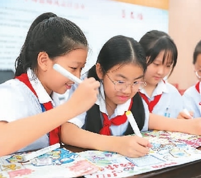 浙江省臺州市路橋區(qū)螺洋小學的學生繪制網(wǎng)絡安全宣傳手抄報。蔣友青攝(人民視覺)