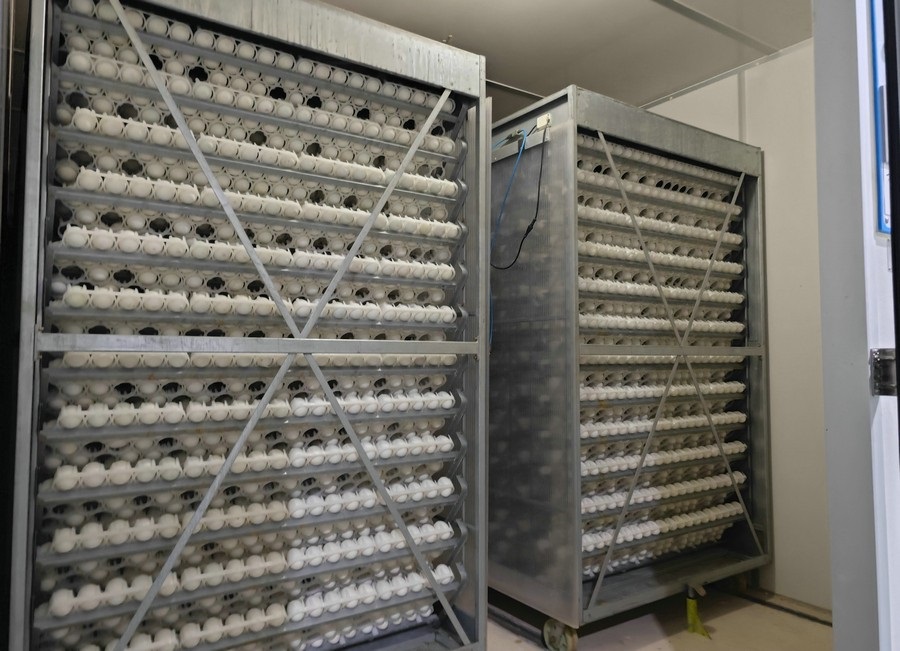 選蛋、稱重、儲蛋、洗蛋、孵化、落盤、出雛、出苗……經(jīng)過一系列程序,并經(jīng)過25天的孵化后,種蛋由孵化車轉(zhuǎn)移到出雛筐,在此等待3天,就完成了由蛋到苗的蛻變。