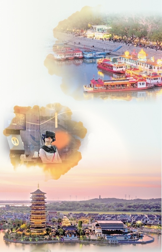 上圖:哈爾濱松花江畔,燈火璀璨、人流如織。施 覺攝 中圖:“尋境敦煌——數(shù)字敦煌沉浸展”中,游客借助VR設備游覽莫高窟。新華社記者 郎兵兵攝 下圖:晚霞映襯下的長沙銅官窯古鎮(zhèn)。長沙銅官窯文化旅游度假區(qū)供圖