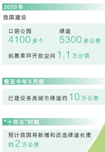 我國將綠色發(fā)展理念融入城鄉(xiāng)規(guī)劃建設管理中,穩(wěn)步推進建設連通區(qū)域、城市、社區(qū)的城鄉(xiāng)綠道體系。2023年,我國建設口袋公園4100多個、綠道5300多公里,拓展草坪開放空間1.1萬公頃,截至今年5月底,已建設各類城市綠道約10萬公里。