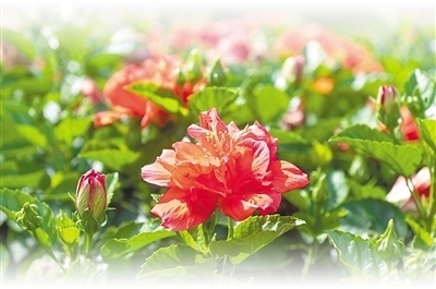 疑若焰生、朝開暮落的朱槿花,在我國古代文學(xué)記載中非常豐富,被賦予了深厚的人文內(nèi)涵?!罢螣熼L暖無霜雪,槿艷繁花滿樹紅。每嘆芳菲四時(shí)厭,不知開落有春風(fēng)?!碧拼娙死罴澗驮谠娭匈潎@,“無霜雪”環(huán)境下生長的朱槿花四季常美。