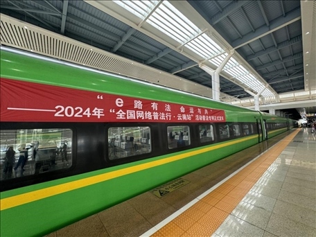 人民網(wǎng)昆明8月22日電 (孝金波、高清揚(yáng))今日,2024年“全國(guó)網(wǎng)絡(luò)普法行·云南站”活動(dòng)在昆明啟動(dòng)。作為活動(dòng)的一大亮點(diǎn),在昆明南站始發(fā)的“e路有法 命運(yùn)與共”普法專列滿載著法律知識(shí),沿著中老鐵路這一國(guó)際大通道,為乘客們打造了別開(kāi)生面的普法之旅。