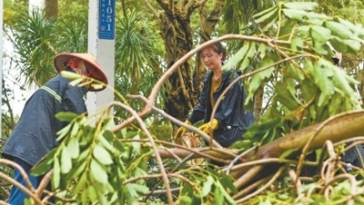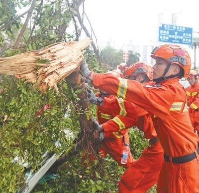9月7日,海南省海口市工作人員在??谑袨I海大道上清理被風吹倒的樹木。新華社記者 楊冠宇攝