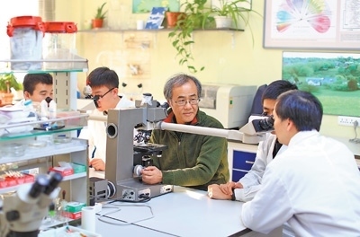 中國(guó)科學(xué)院院士宋微波(中)在指導(dǎo)學(xué)生開展科研。