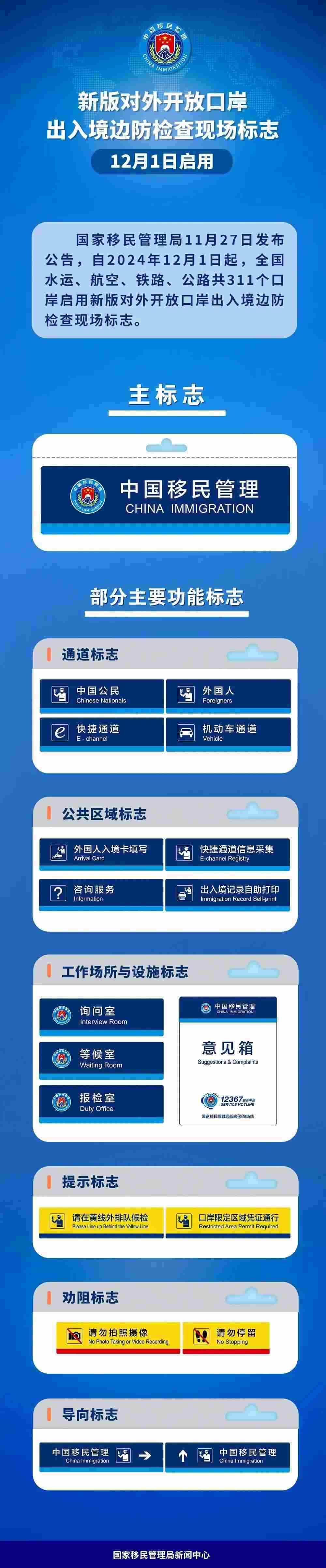 人民網(wǎng)北京11月27日電 (記者梁秋坪、郝萍)國家移民管理局11月27日發(fā)布公告,自2024年12月1 日起,全國水運(yùn)、航空、鐵路、公路共311個(gè)口岸啟用新版對(duì)外開放口岸出入境邊防檢查現(xiàn)場標(biāo)志。