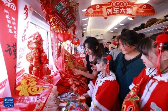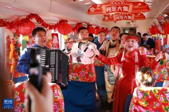 當(dāng)日,黑龍江開啟2025年首個“列車大集”,在齊齊哈爾開往滿洲里的4187次列車上,乘客購年貨、品民俗、觀看非遺表演,在歸家的旅途中感受濃濃的年味。