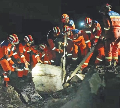 2月8日晚,在筠連縣山體滑坡現(xiàn)場,消防救援人員進(jìn)行搜救。