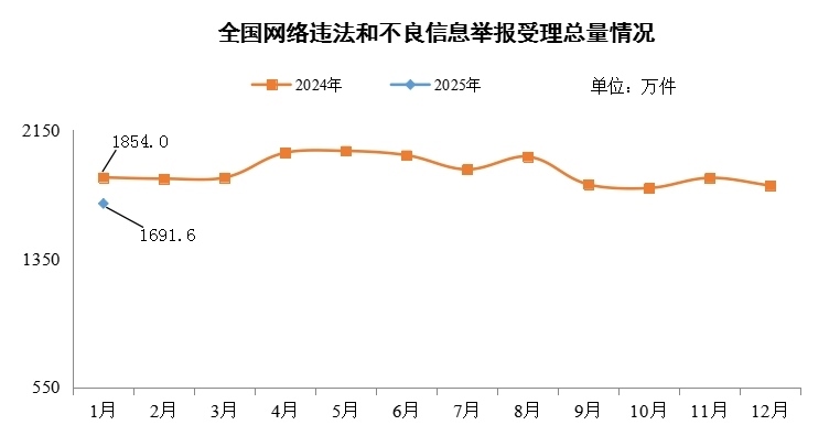 中央網(wǎng)信辦舉報(bào)中心2月17日公布的數(shù)據(jù)顯示,2025年1月,中央網(wǎng)信辦舉報(bào)中心指導(dǎo)全國(guó)各級(jí)網(wǎng)信舉報(bào)工作部門(mén)、主要網(wǎng)站平臺(tái)受理網(wǎng)民舉報(bào)色情、賭博、侵權(quán)、謠言等違法和不良信息1691.6萬(wàn)件,環(huán)比下降6.2%、同比下降8.8%。