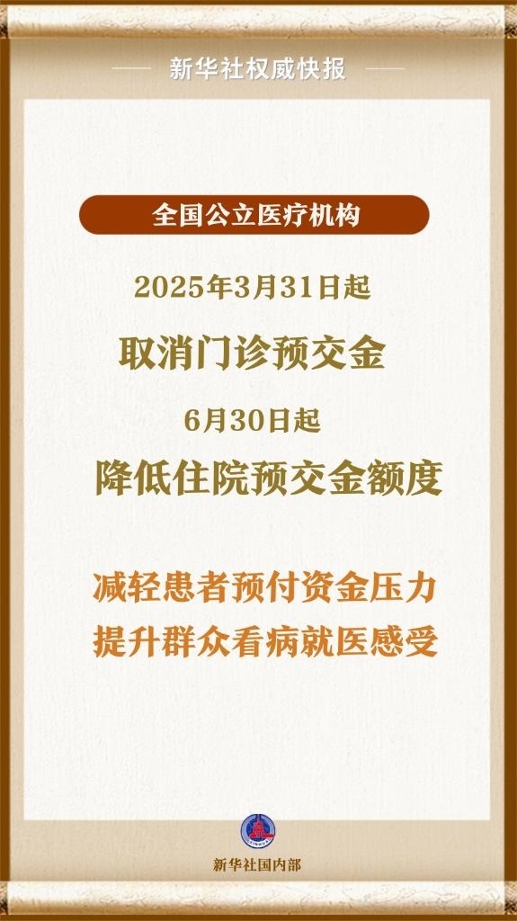 國家衛(wèi)生健康委、財政部、國家醫(yī)保局等6部門日前聯(lián)合印發(fā)《關(guān)于規(guī)范公立醫(yī)療機(jī)構(gòu)預(yù)交金管理工作的通知》,要求公立醫(yī)療機(jī)構(gòu)自2025年3月31日起全面停止收取門診預(yù)交金,自2025年6月30日起降低住院預(yù)交金額度。