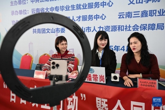 4月9日,工作人員在云南省文山學(xué)院招聘會現(xiàn)場進(jìn)行“直播帶崗”。
