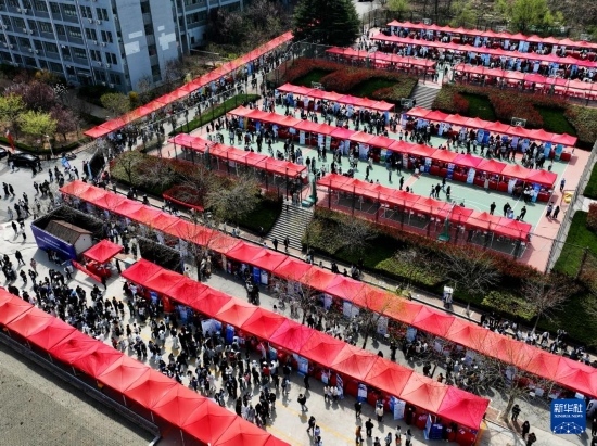 這是4月11日在山東青島科技大學(xué)拍攝的2025年春季綜合類大型雙選會招聘活動現(xiàn)場(無人機照片)。