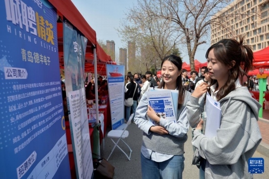 4月11日,學(xué)生在山東青島科技大學(xué)2025年春季綜合類大型雙選會招聘活動現(xiàn)場查看企業(yè)資料。