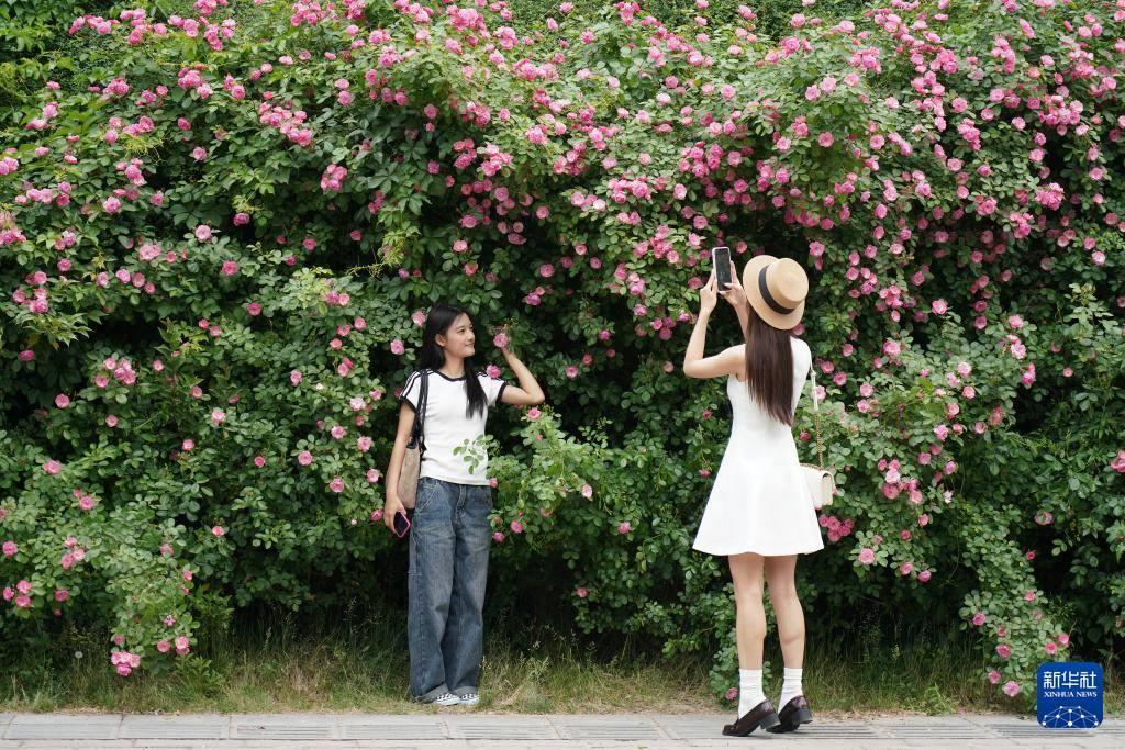 游人在西安曲江池遺址公園內拍照(4月25日攝)。