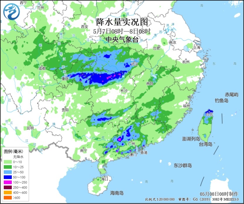 氣象監(jiān)測顯示,昨日,重慶東部、湖北西南部、湖南西北部、廣西東北部、廣東中西部及臺灣島北部等地部分地區(qū)出現大到暴雨,重慶彭水、湖北恩施、湖南張家界、廣東肇慶和江門等局地大暴雨(100~192毫米)。