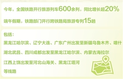 國(guó)鐵集團(tuán)數(shù)據(jù)顯示:今年全國(guó)鐵路已開(kāi)行旅游列車600余列,同比增長(zhǎng)超20%。端午假期,鐵路部門開(kāi)行跨鐵路局旅游專列15趟,包括從黑龍江哈爾濱、遼寧大連、廣東廣州出發(fā)至新疆烏魯木齊、喀什,湖北武昌、四川成都出發(fā)至黑龍江哈爾濱、內(nèi)蒙古海拉爾,江西上饒出發(fā)至河北山海關(guān)、黑龍江塔河等線路。