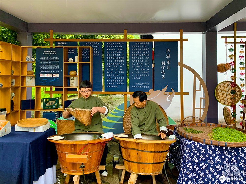△西湖龍井以“色綠、香郁、味甘、形美”著稱于世,這是制作技藝展示區(qū)。(總臺(tái)央視記者段德文拍攝)