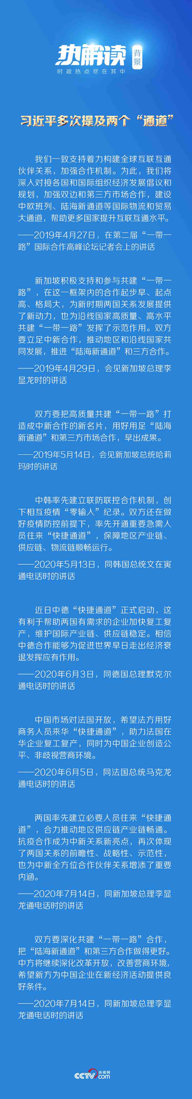 7月14日,習(xí)近平主席同新加坡總理李顯龍通電話。他在通話中表示,“疫情發(fā)生以來(lái),中新兩國(guó)政府和各界互施援手,守望相助”,并特別提到了“快捷通道”和“陸海新通道”這兩條“通道”。