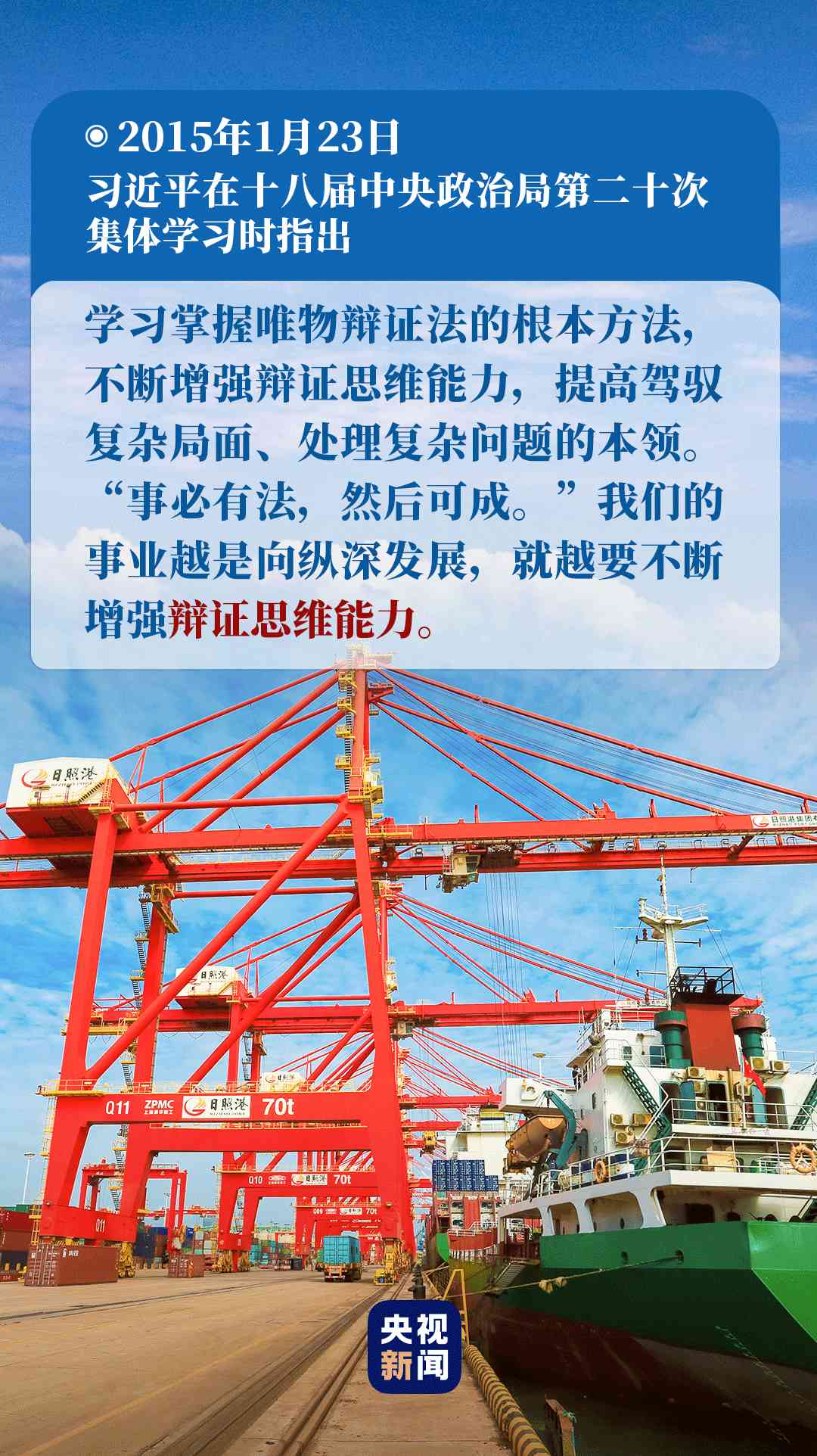 “要堅持發(fā)展地而不是靜止地、全面地而不是片面地、系統(tǒng)地而不是零散地、普遍聯(lián)系地而不是單一孤立地觀察事物,妥善處理各種重大關(guān)系?!?015年1月23日,習(xí)近平在十八屆中央政治局第二十次集體學(xué)習(xí)時的講話中,對如何在實際工作中運用唯物辯證法,作出了深刻闡述。