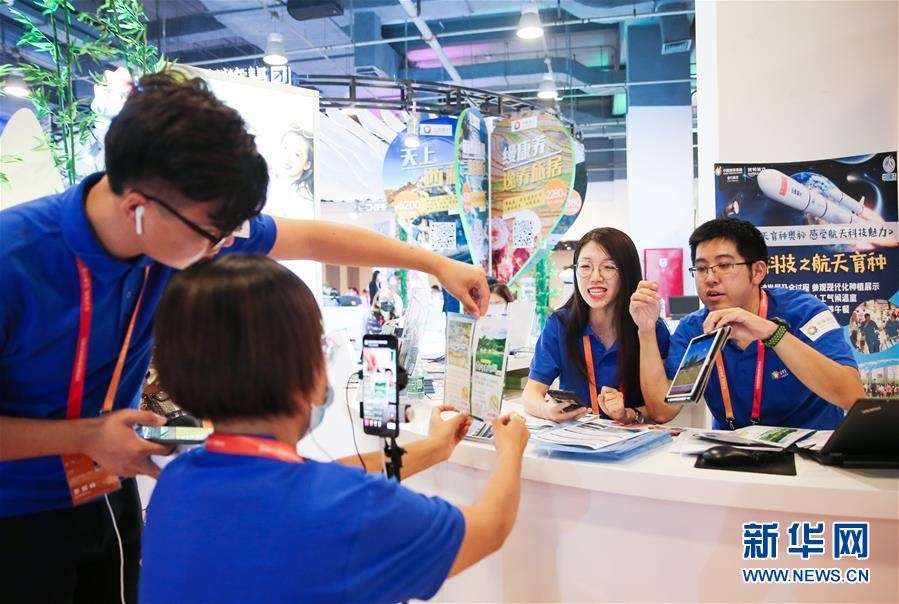 在2020年中國國際服務貿(mào)易交易會旅游服務專題展區(qū),中國旅游集團展位的工作人員通過直播向線上觀眾介紹旅游服務產(chǎn)品(2020年9月5日攝)。新華社記者潘思危攝