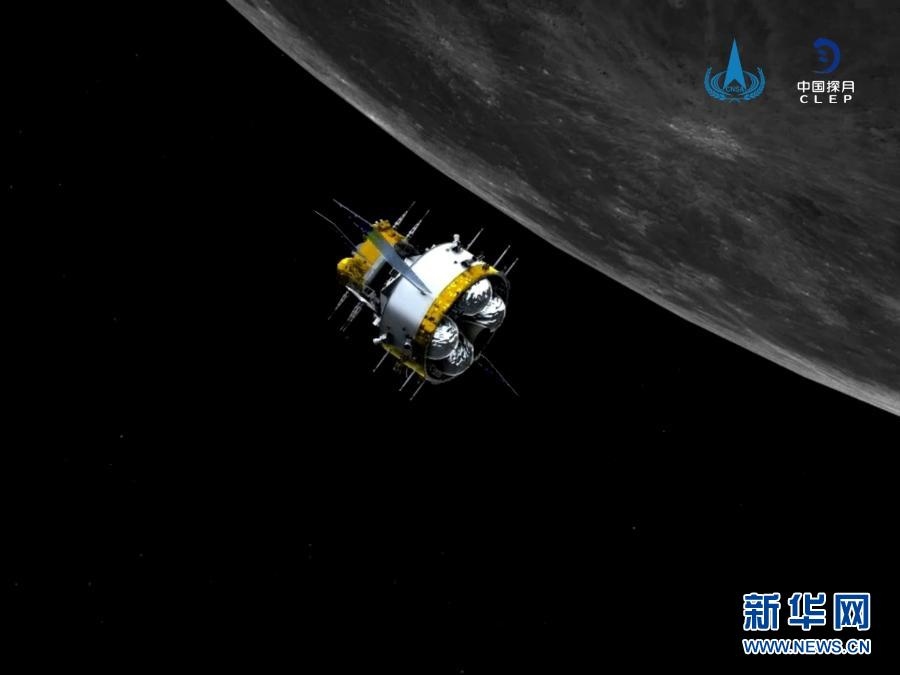 軌返組合體與上升器分離前模擬圖。記者從國家航天局獲悉,北京時(shí)間12月6日12時(shí)35分,嫦娥五號(hào)軌道器返回器組合體與上升器成功分離,進(jìn)入環(huán)月等待階段,準(zhǔn)備擇機(jī)返回地球。新華社發(fā)(國家航天局供圖)