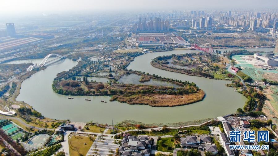 這是11月14日拍攝的江蘇省揚(yáng)州市運(yùn)河三灣生態(tài)文化公園景色(無人機(jī)照片)。新華社記者 季春鵬 攝