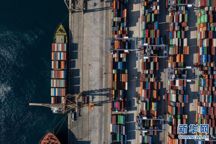 這是2019年9月6日航拍的??吭谙ED比雷埃夫斯港集裝箱碼頭的中遠海運銀河輪。新華社發(fā)(萊夫特里斯·帕察里斯攝)