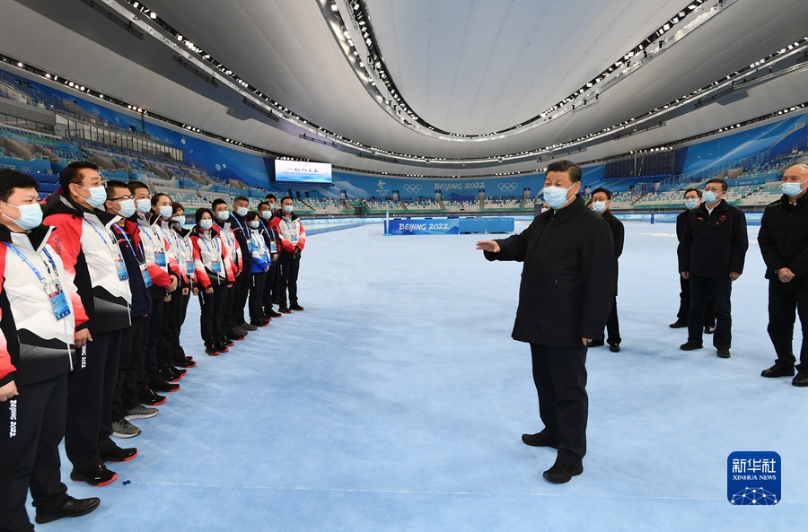 1月4日,中共中央總書記、國家主席、中央軍委主席習(xí)近平在北京考察2022年冬奧會(huì)、冬殘奧會(huì)籌辦備賽工作。這是4日上午,習(xí)近平在國家速滑館考察。新華社記者 謝環(huán)馳 攝