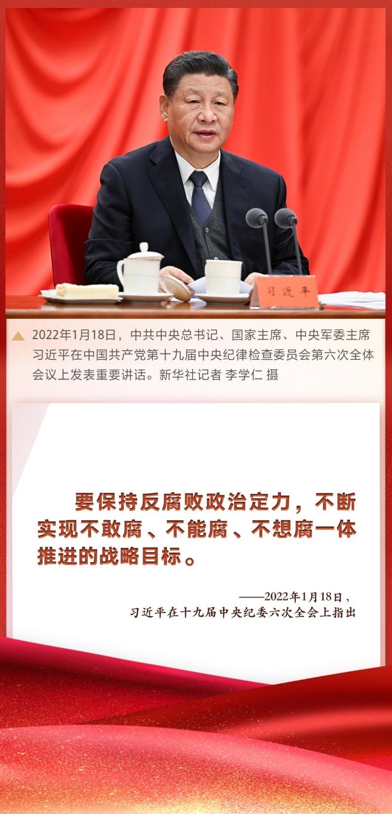 “要保持反腐敗政治定力,不斷實(shí)現(xiàn)不敢腐、不能腐、不想腐一體推進(jìn)的戰(zhàn)略目標(biāo)?!敝泄仓醒肟倳?shū)記、國(guó)家主席、中央軍委主席習(xí)近平在十九屆中央紀(jì)委六次全會(huì)上發(fā)表重要講話(huà),深刻總結(jié)新時(shí)代黨的自我革命的成功實(shí)踐,深刻闡述全面從嚴(yán)治黨取得的歷史性、開(kāi)創(chuàng)性成就,產(chǎn)生的全方位、深層次影響,對(duì)堅(jiān)持不懈把全面從嚴(yán)治黨向縱深推進(jìn)、迎接黨的二十大勝利召開(kāi)作出戰(zhàn)略部署。