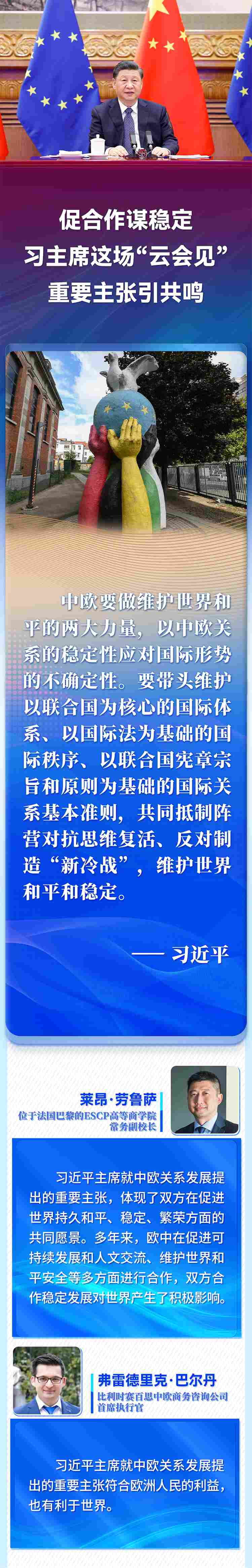 國家主席習(xí)近平4月1日晚在北京以視頻方式會見歐洲理事會主席米歇爾和歐盟委員會主席馮德萊恩。歐洲多國人士高度評價(jià)習(xí)近平主席就中歐關(guān)系、烏克蘭危機(jī)等問題提出的重要主張,認(rèn)為會晤為雙方關(guān)系持續(xù)健康發(fā)展作出戰(zhàn)略引領(lǐng),為復(fù)雜動蕩的國際局勢注入穩(wěn)定性。