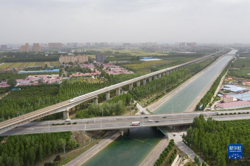 在河北省石家莊市正定縣以北的于家莊村附近,南水北調(diào)中線干渠與高鐵、公路交織(2021年5月24日攝,無人機(jī)照片)。新華社記者 才揚(yáng) 攝