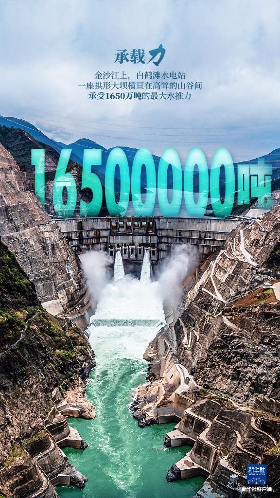 金沙江上,白鶴灘水電站,一座拱形大壩橫亙在高聳的山谷間,承受1650萬噸的最大水推力。