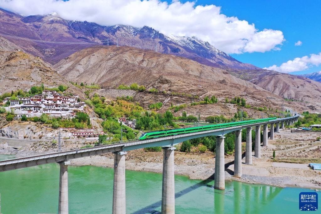 復(fù)興號(hào)列車行駛在西藏朗縣境內(nèi)(2022年4月14日攝)。新華社記者 覺(jué)果 攝