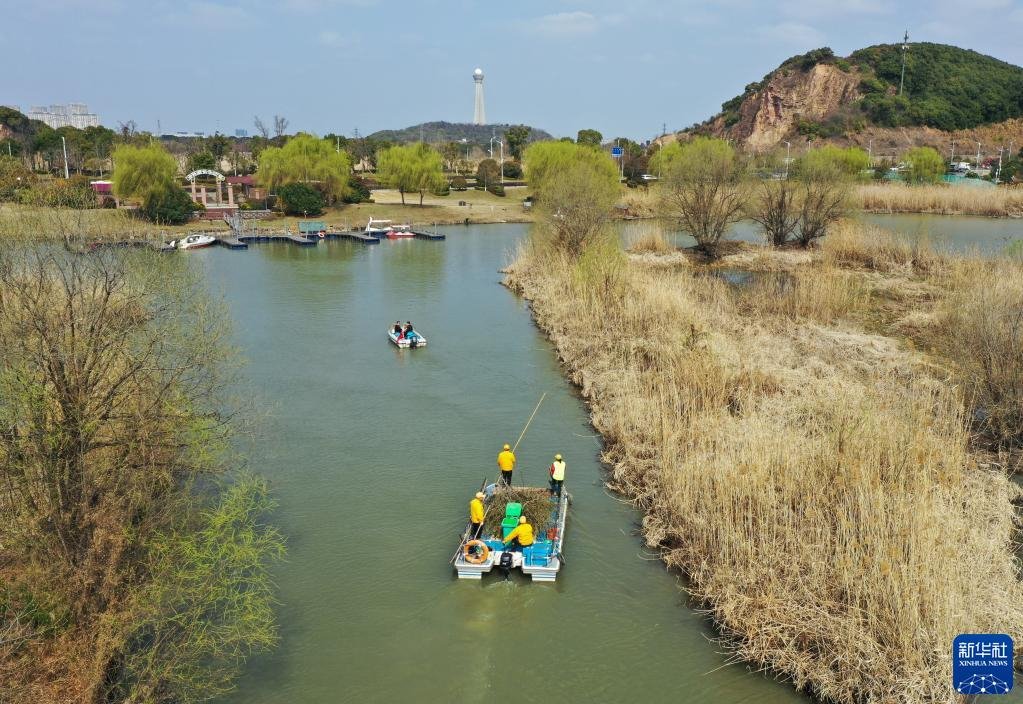 浙江省湖州市吳興區(qū)八里店鎮(zhèn)移沿山村河長(zhǎng)帶隊(duì)在移沿山村開展巡河、保潔作業(yè)(2021年2月24日攝,無(wú)人機(jī)照片)。新華社記者 翁忻旸 攝