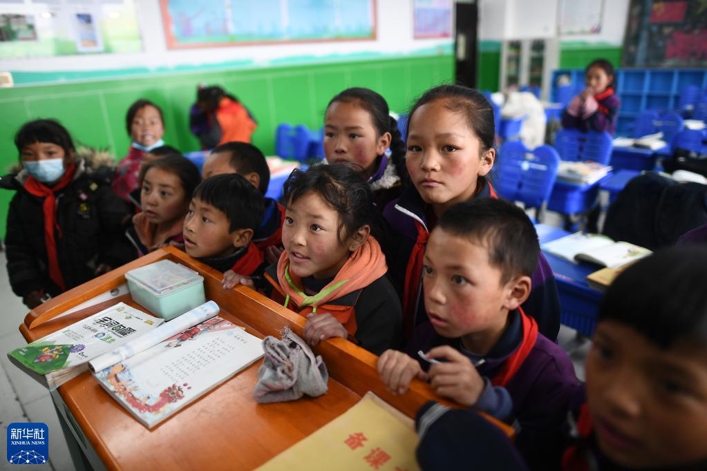 青海省果洛藏族自治州瑪多縣民族寄宿制中學(xué)二年級(jí)的學(xué)生在課間觀看多媒體課件(2021年3月26日攝)。該校采用清潔取暖方式后,學(xué)生的學(xué)習(xí)和生活環(huán)境大為改善。新華社記者 張宏祥 攝