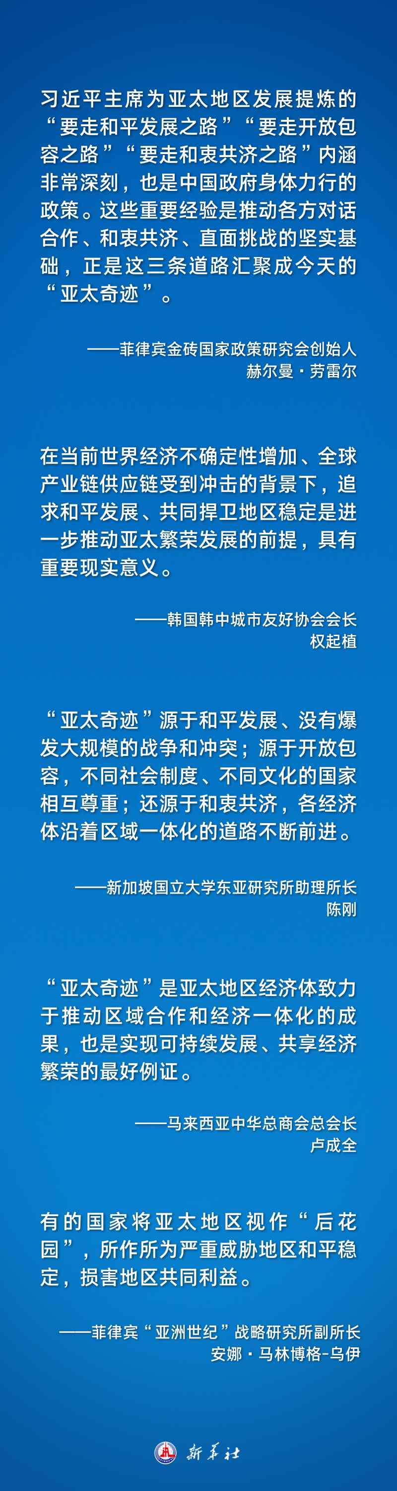 習(xí)近平主席在總結(jié)亞太合作的歷史經(jīng)驗(yàn)時(shí)指出:“亞太奇跡”是靠大家攜手奮斗、爬坡過坎創(chuàng)造的。亞太過去幾十年經(jīng)濟(jì)快速增長,得益于和平穩(wěn)定的環(huán)境。歷史反復(fù)證明,開放包容、合作共贏才是人間正道。