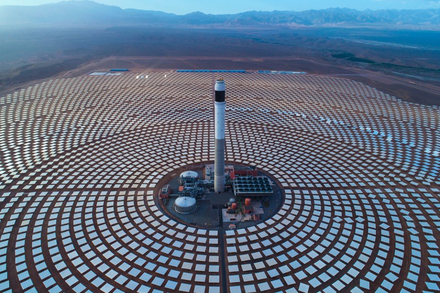 這是2018年6月7日在摩洛哥瓦爾扎扎特拍攝的努奧光熱電站項(xiàng)目三期工程(航拍照片)。從2015年起,中國(guó)電建集團(tuán)下屬的山東電建三公司在瓦爾扎扎特承建努奧光熱電站項(xiàng)目二期和三期工程。努奧光熱電站為超過百萬(wàn)的摩洛哥家庭提供清潔能源。