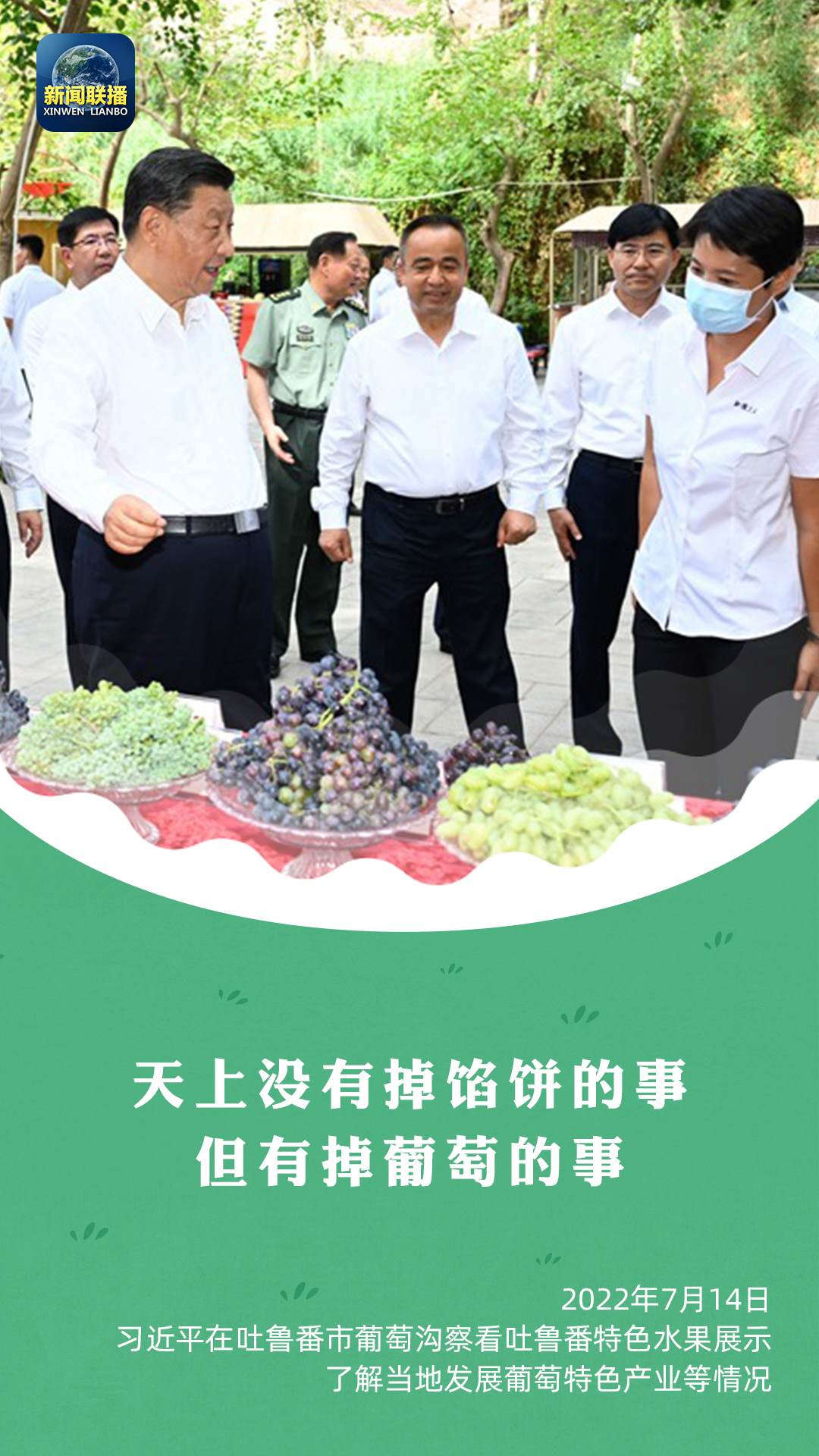 今年7月14日,習近平來到吐魯番市考察調(diào)研。在葡萄溝,習近平察看吐魯番特色水果展示。當?shù)仄咸哑贩N紛繁,琳瑯滿目。